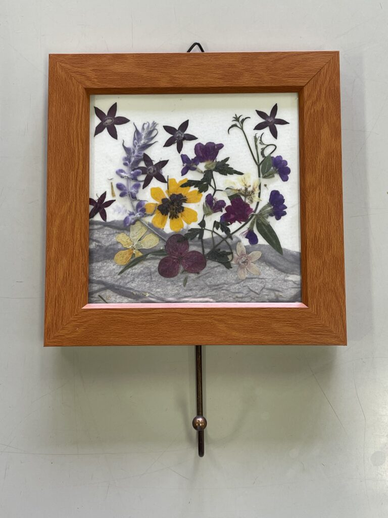 フック🪝付きプレートに押し花をデザインしていただきました。グレーの台紙に深い紫系のペンタス、アメジストセージ、紫陽花などを置き、大人のイメージです。その中にワンポインとの黄色のハルシャ菊が目立っていますね。
