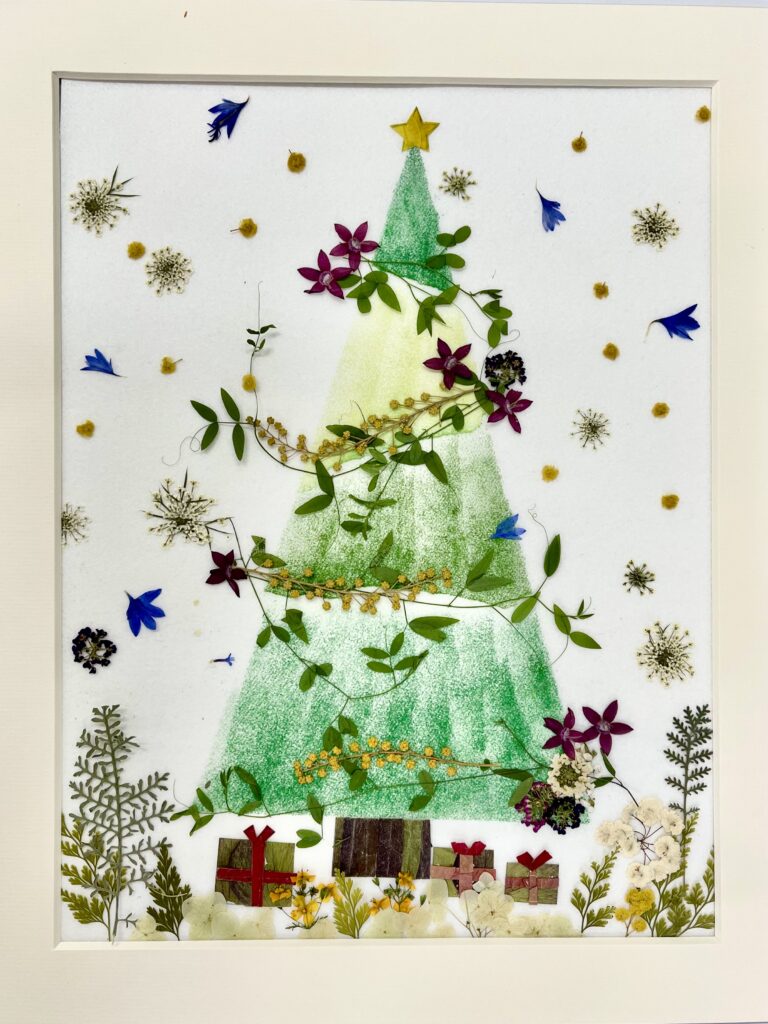 いよいよクリスマス🎄です。タイムリーに押し花でツリーの額を作っていただきました。土台はパステルです。その上に雀のエンドウやミモザで飾り付けをしました。素敵に出来ましたね。プレゼントもお洒落ですね。