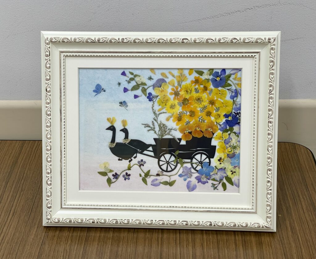 投稿日: 2025年11月8日横浜読売カルチャー、不思議な花倶楽部押し花教室、彩の丘相模原押し花サークル アヒルの押し花額を作っていただきました。黄色のお花がいっぱい、クルマに積まれています。元気が出ますね。アヒルの冠や、ネクタイが可愛いですね。アイデアがいっぱいですね。 ・ 横浜、町田、相模原、座間、厚木で 押し花教室を開催しております。・ ワンデーレッスンも行っています。 授業料:1回2時間2,000円、材料費:小物1,000円程度・ 日時はご相談ください。・ 押し花体験レッスンもしております。詳細はこちらから。・ お問い合わせはこちらから。